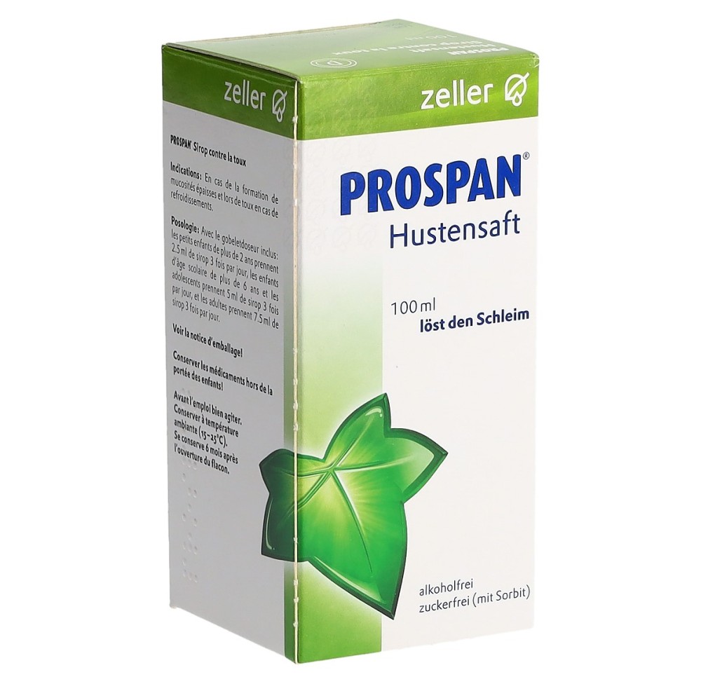 Informations sur le produit Domaine d'application PROSPAN® Sirop contre la toux est utilisé en cas de: Formation excessive de mucosités visqueuses et de toux en cas de refroidissement - à partir de 2 ans - Expectorant - Dilate les bronches Dosage / application / emballage Adultes: Prendre 7,5 ml de sirop 3 fois par jour Enfants à partir de 6 ans et adolescents: Prendre 5 ml de sirop 3 fois par jour Enfants à partir de 2 ans: Prendre 2,5 ml de sirop 3 fois par jour Emballages: 100 ml 200 ml Substances actives 5 ml contiennent les principes actifs suivants: 35 mg d’extrait sec EA575® de feuilles de lierre (Hederae helicis folium)